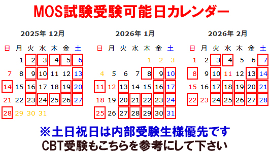 MOS&CBT受験受け入れ可能日カレンダー